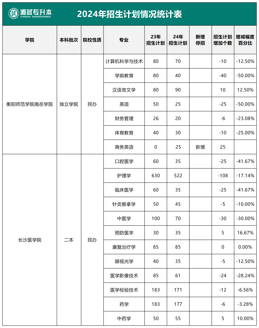 民办院校“有手就行”? 先说说大家最关心的问题,民办院校是不是真的有手就行,报了就能上? 试总告诉大家:没那么美的事儿?~ 以24年湖南统招专升本考试的数据为例,从整体的招生情况来看,湖南省2024年专升本报名人数达到了73000余人,而招生计划仅为20009人,录取比例约为27.4%,这是近年来首次缩招。 试总觉得,这也显示出了专升本考试的竞争是日益激烈的,在这种背景下,民办院校的上岸难度也会随之增加。 试总在这儿给大家提供衡阳师范学院南岳学院与长沙医学院24年招生计划的数据,大家不难发现,对比于23年来说,招生计划都是有所减少的。尽管报考总人数也减少了,但这一降幅远远未能填补因缩招造成的录取名额缺口 从整体上来看24年湖南民办院校的招生情况,只有湖南应用技术学院有扩招,其他学校都缩减了招生名额。。