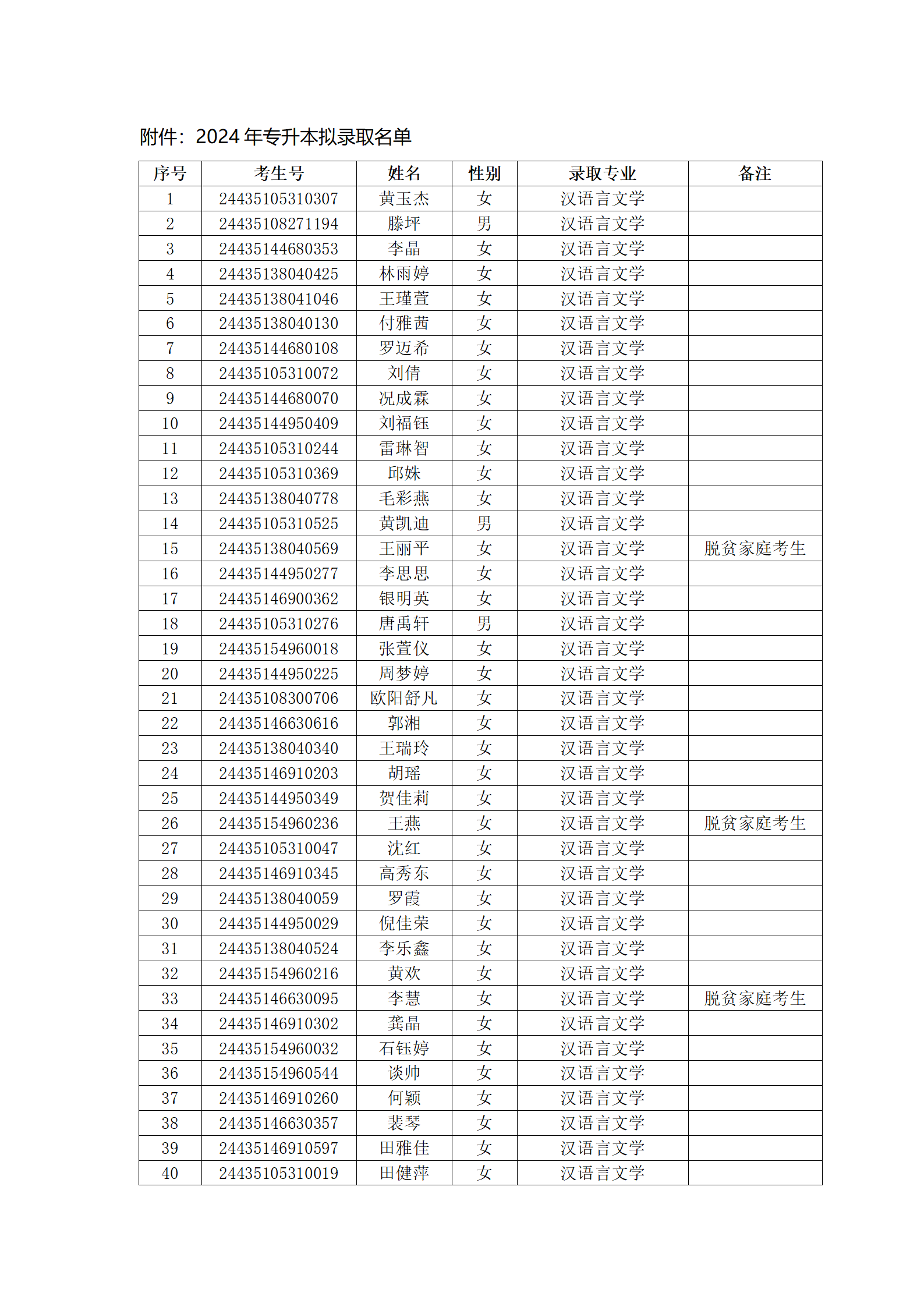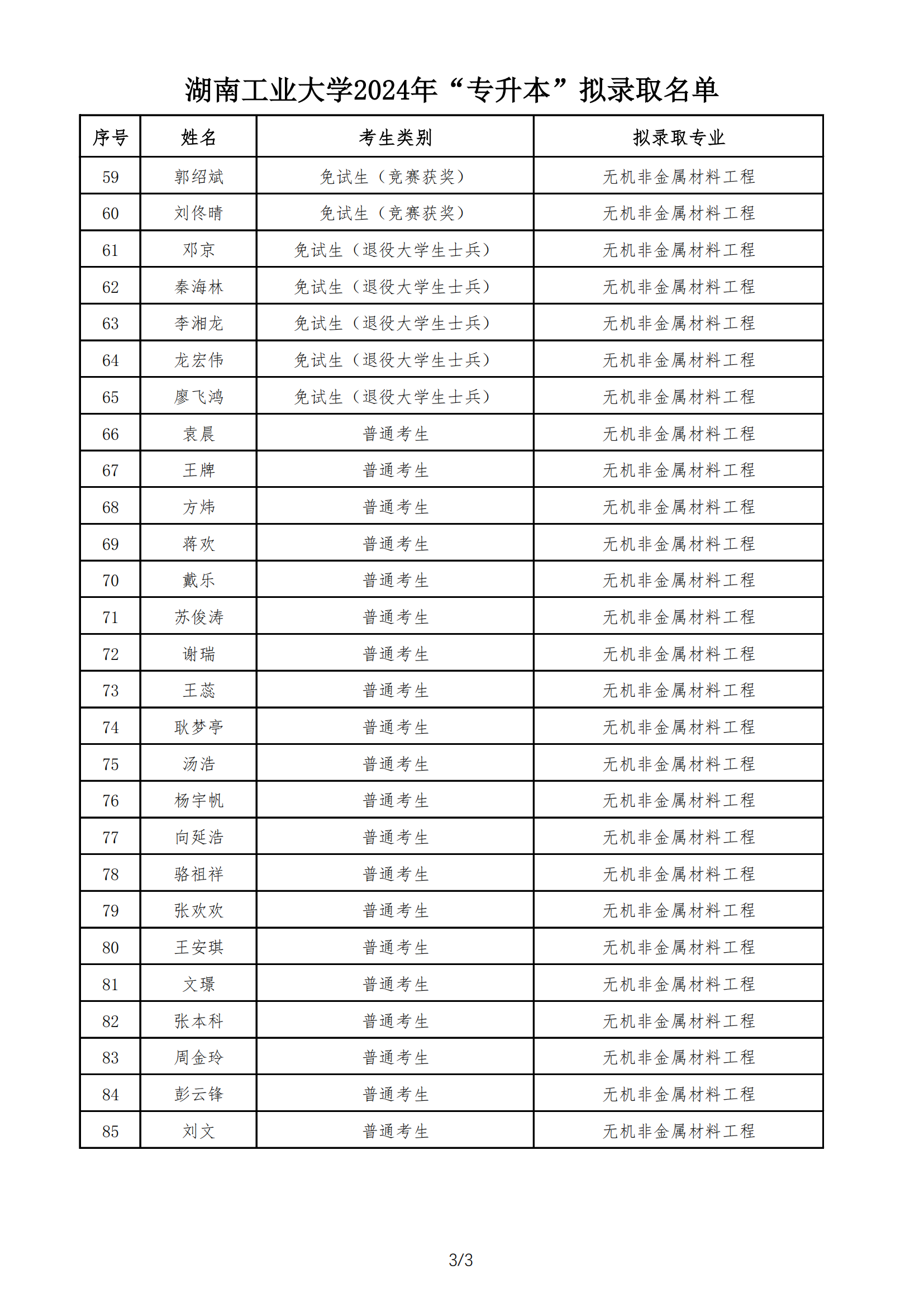 湖南工业大学2024年“专升本” 拟录取名单公示
