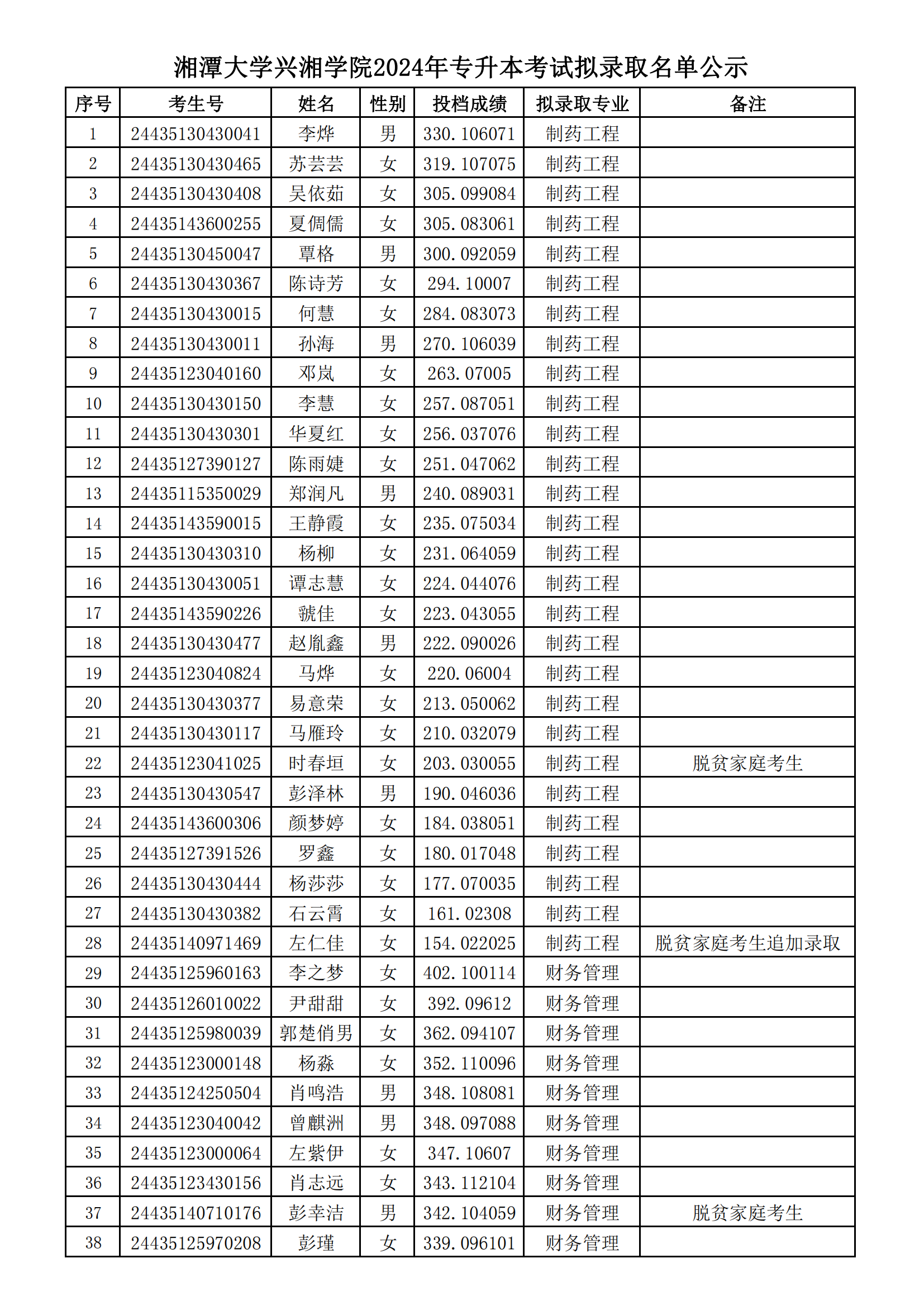 湘潭大学兴湘学院2024年专升本考试拟录取名单公示