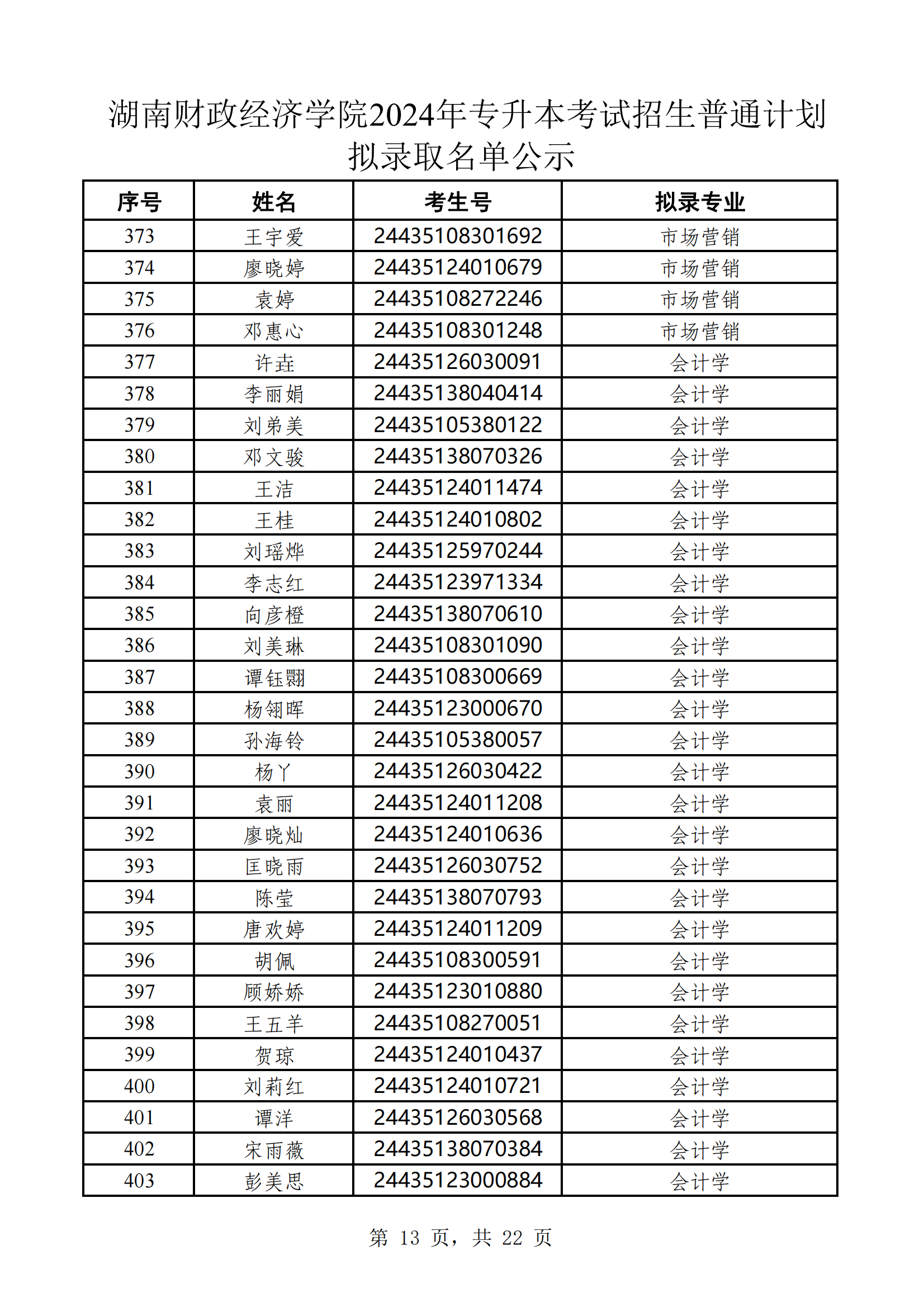 湖南财政经济学院2024年专升本考试招生普通计划拟录取名单公示