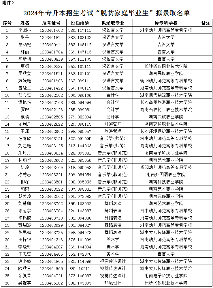 湖南第一师范学院2024年专升本招生考试普通计划拟录取学生名单公示根据湖南省教育厅《关于做好 2024 年湖南省普通高等学校专升本考试招生工作的通知》(湘教发〔2023〕50号)及湖南省教育考试院《关于做好我省2024年普通高 升本资讯 2024-06-03