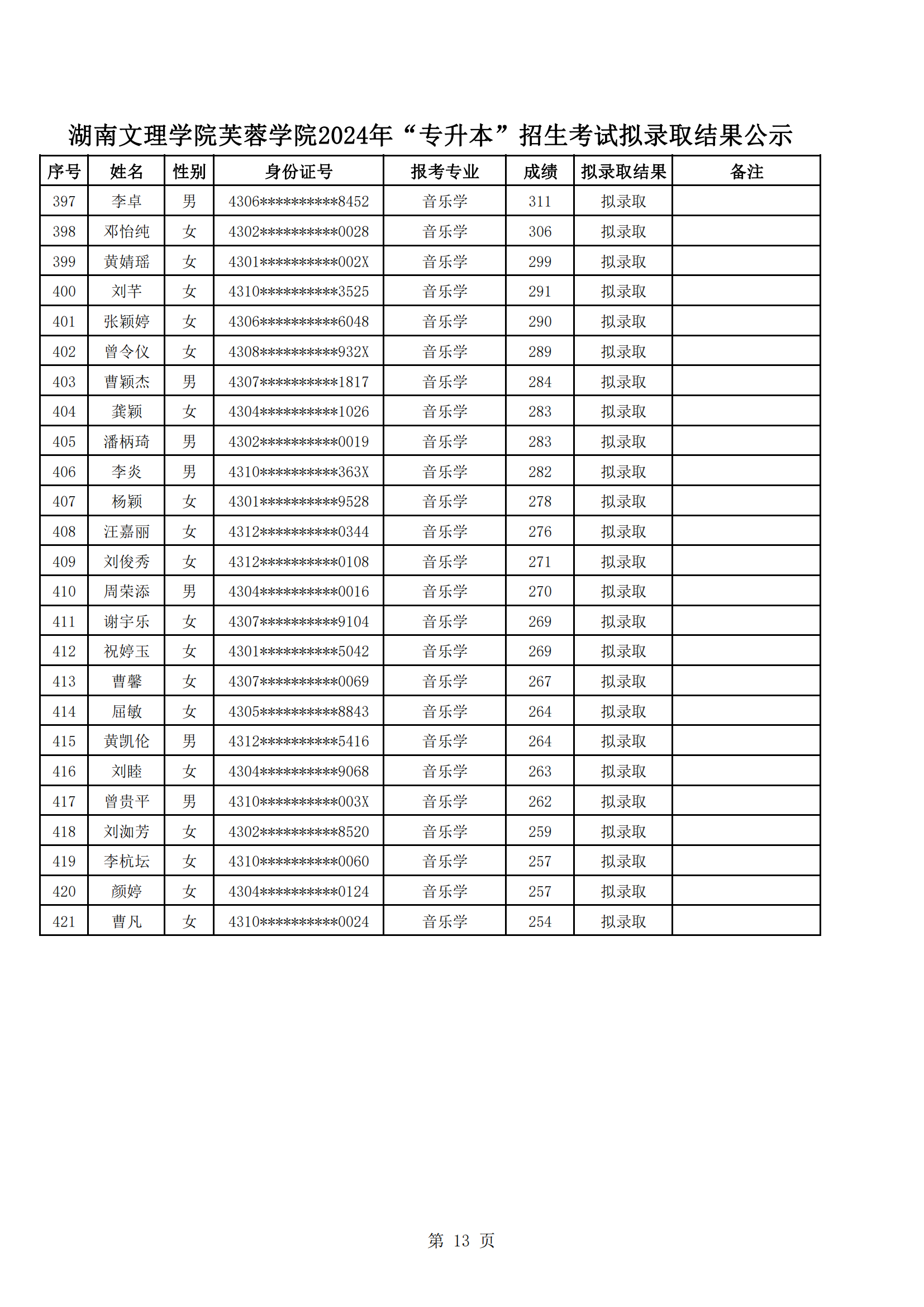 湖南文理学院芙蓉学院2024年“专升本”招生考试拟录取名单公示根据湖南省教育厅《关于做好2024年湖南省普通高等学校专升本考试招生工作的通知》(湘教发〔2023〕50号)文件精神、《湖南文理学院芙蓉学院2024年普通高校专 升本资讯 2024-06-03