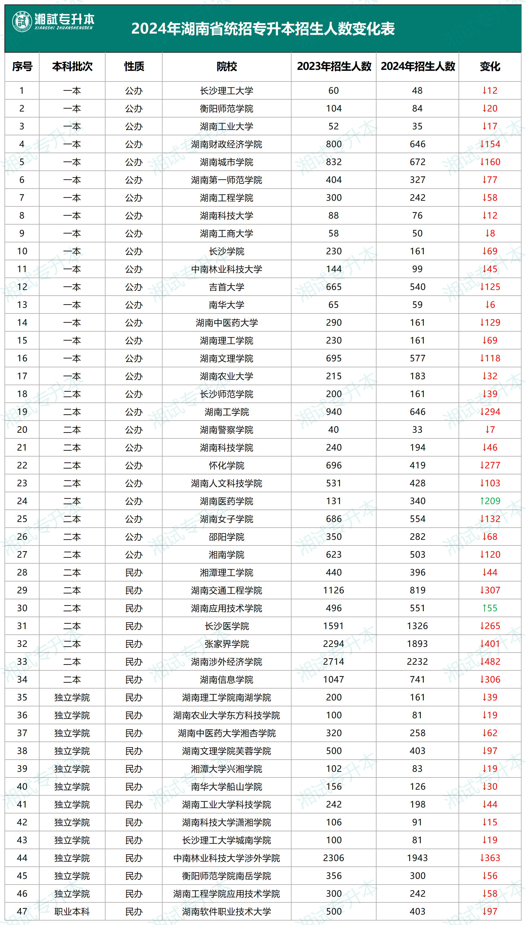 2024年湖南专升本共47所院校招生在这些招生院校中哪所院校招生人数最多呢?最多招了多少人?今天试总将湖南统招专升本47所院校23年与24年的招生人数汇成了一个